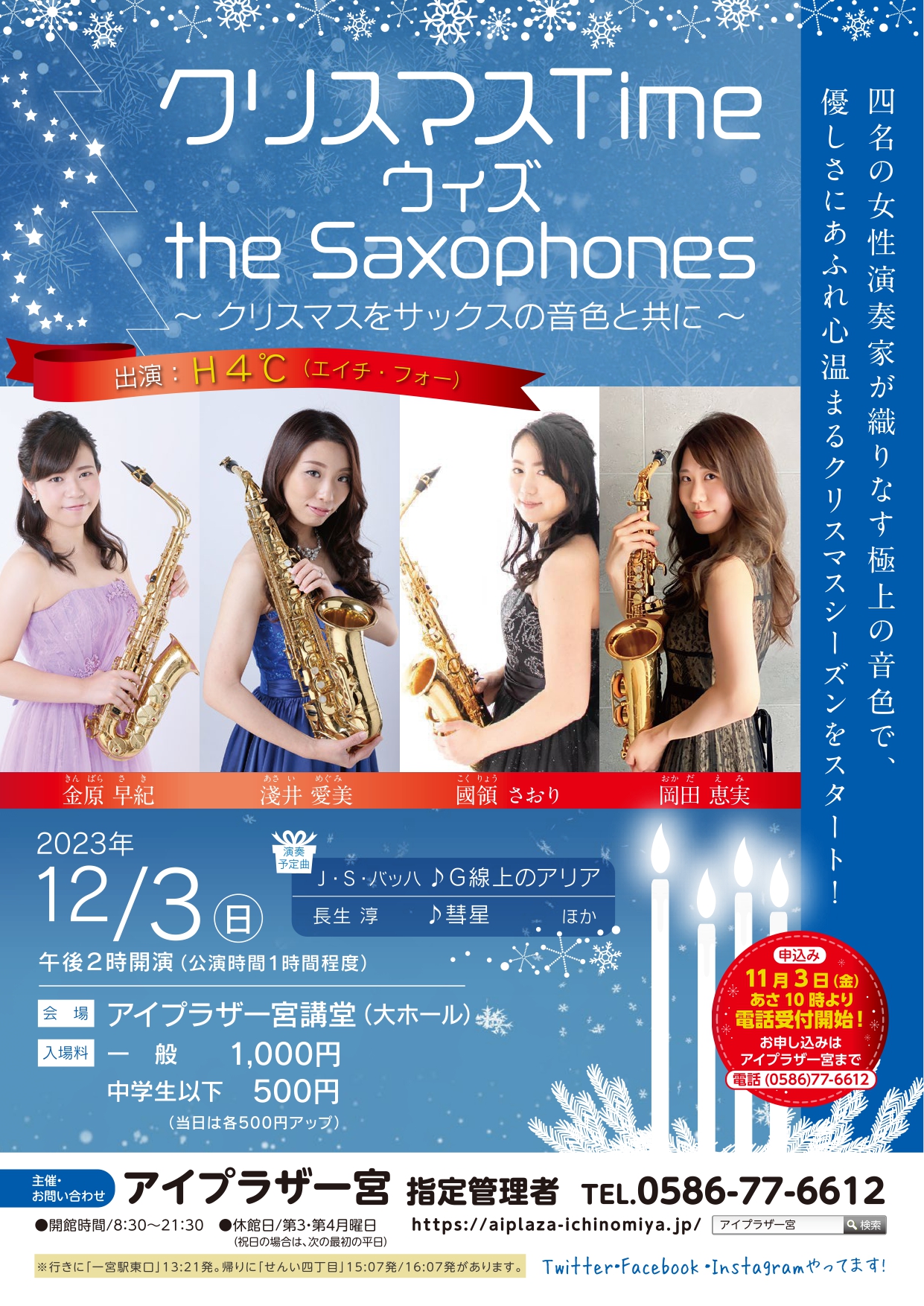 自主文化事業「H4℃クリスマスコンサート クリスマスTimeウィズthe Saxophones」の情報をアップしました。
