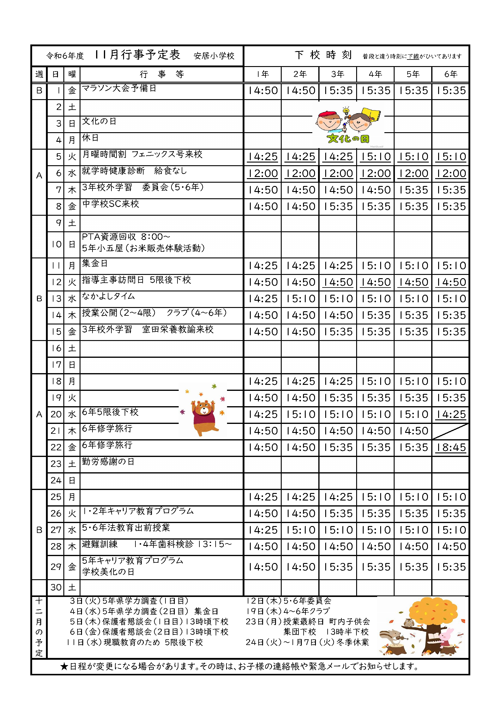 市立安居小学校市立安居小学校(日華化学前駅:小学校)の2024年11月2日のホームページ更新情報です