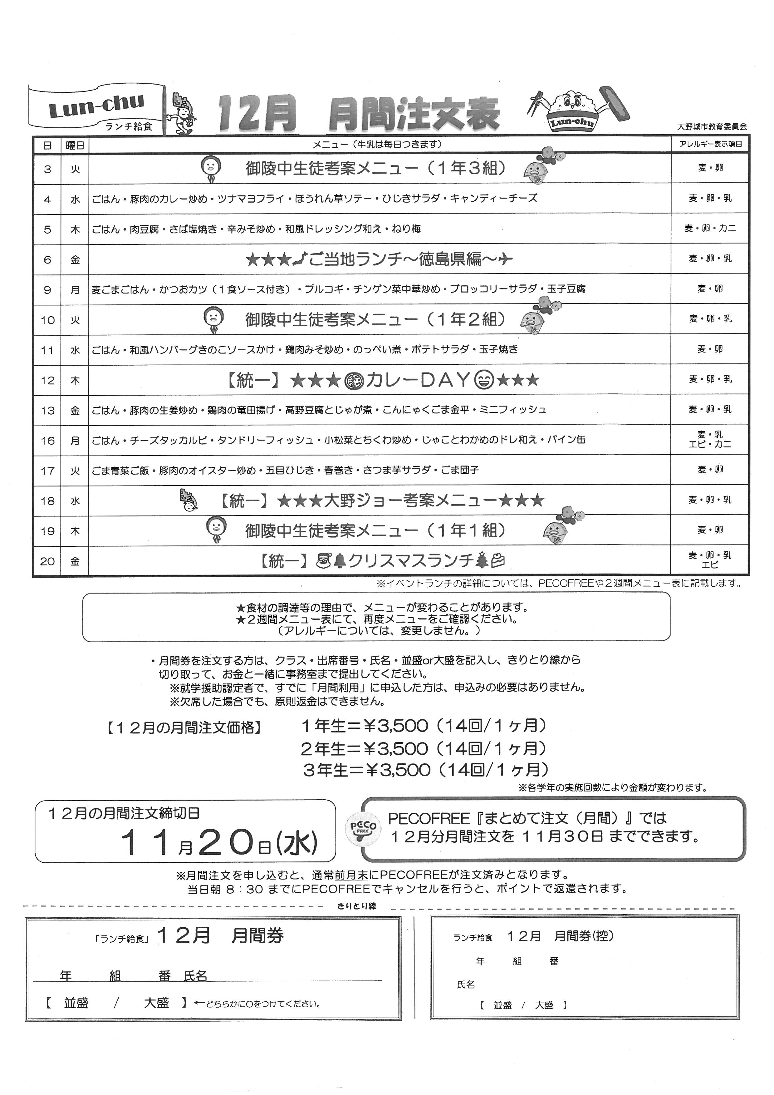 ランチ給食12月 月間注文表