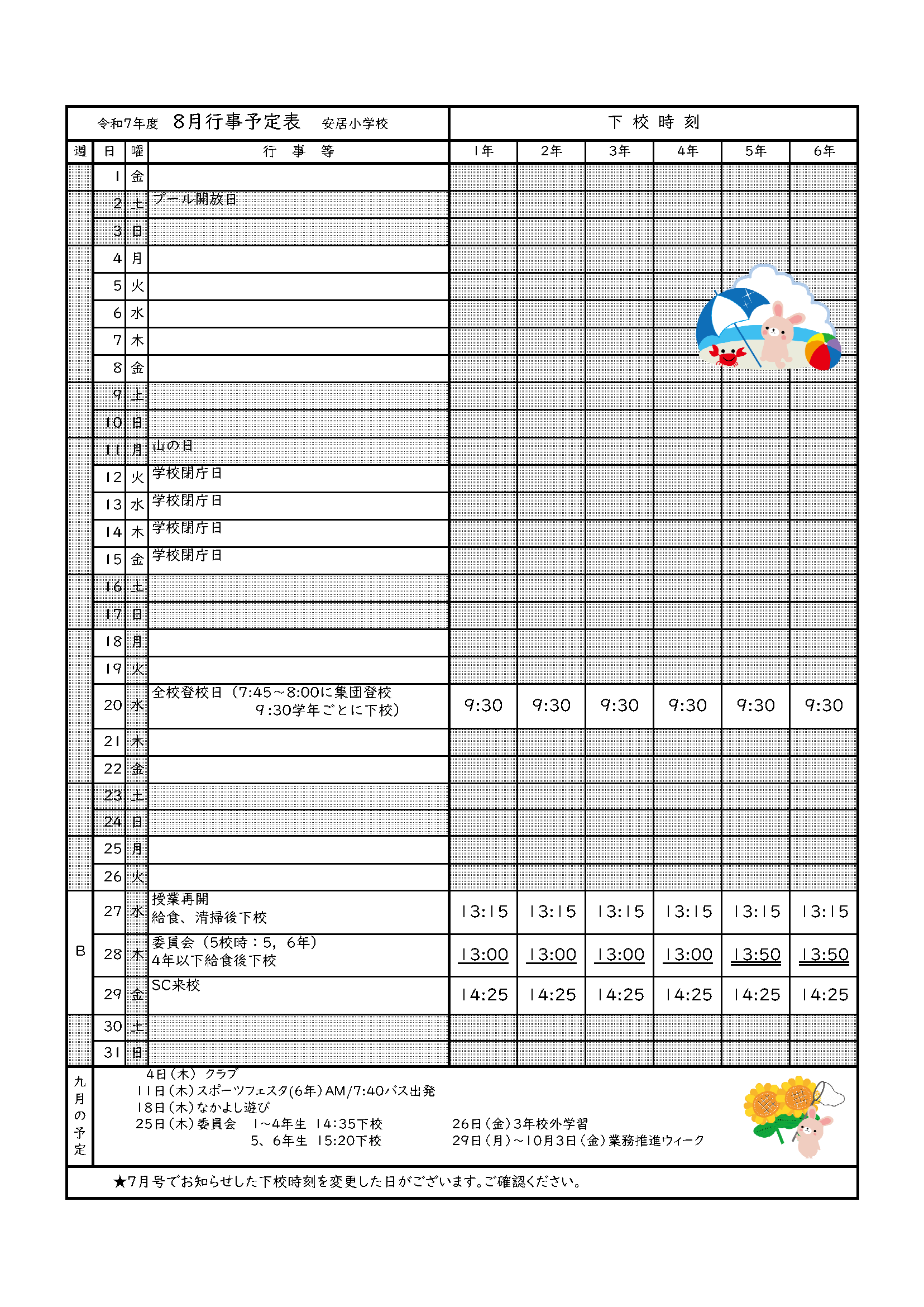 市立安居小学校市立安居小学校(日華化学前駅:小学校)の2025年7月18日のホームページ更新情報です